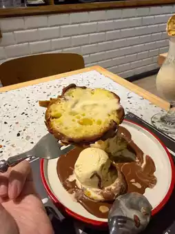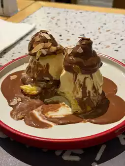 The dessert was the perfect finishing touch! The choux pastry filled with vanilla ice cream and topped with warm chocolate sauce was sweet but not overwhelming. The portion was just right, making for a perfect ending to the meal!