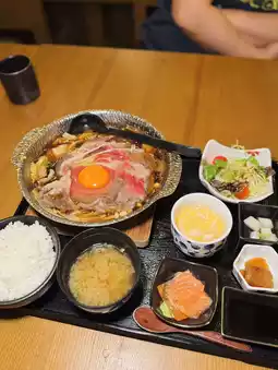 Hot Kansai style sukiyaki🍲! The beef is infused with sweet soy sauce soup - there are tofu, wild vegetables 🥬, and vermicelli 🍠 at the bottom, and it's satisfying with pearl rice. If it's served with udon, it's certainly even better😋.