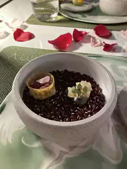 Tonight I came to a romantic and romantic restaurant with rose petals on the table. It felt sweet.