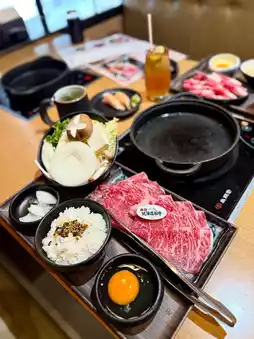 The restaurant uses "Japanese🇯🇵 A4 Kuroshima Wagyu", the package comes with: pickled appetizer (grapefruit carrot), vegetable box 🥬, Japanese sterile egg 🥚, Japanese rice / Sanuki udon 🍜 ️