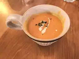 (The carrot soup is rich with carrot puree, offering a healthy and satisfying texture.)