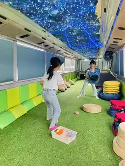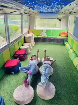 This is a small, double-decker space. The lower level is reserved for private seating, and upstairs is a play area where you can even watch movies in the evening!