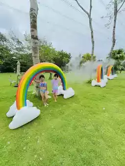 This is a super photogenic lawn park, with beautiful rainbows and adorable animals. From coconut trees to watermelons, you can run after the spray, shoot them with water guns, and jump into the pool. It's a blast! Don't worry, there's a hot tub for a shower afterward :)