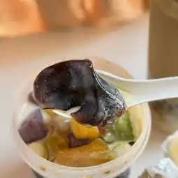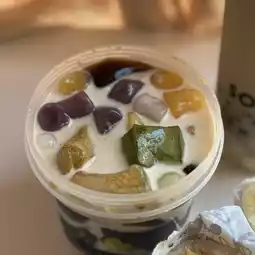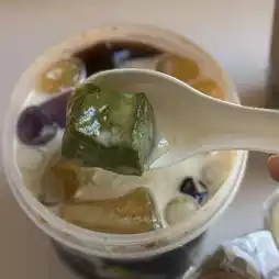 Fern cake has yellow bean powder and matcha flavors as well as small balls and taro balls, smoky and tough, and small balls, with elixir base, low-sugar soy milk and not too sweet, very rich, plenty of portions, share with others!