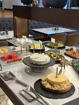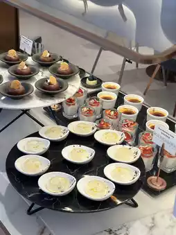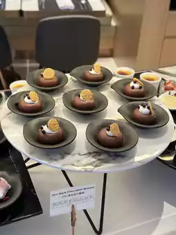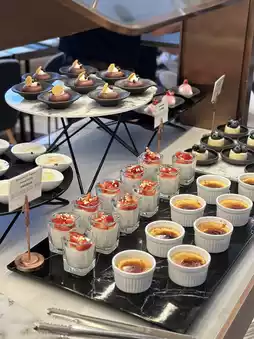 The dessert section is beautifully presented with a wide variety of options: macarons, bread pudding, crème brûlée, strawberry yogurt panna cotta, blueberry cheesecake, raspberry chocolate mochi, dark chocolate mousse, yuzu jelly, and more! Each piece is small, allowing you to try all the options, and their petite size makes them even more exquisite and appealing.