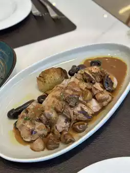 The Miyazaki rice-fed pork loin from Japan is pre-sliced for convenience and served with a rich mushroom sauce. Each bite is tender and infused with a smoky grilled flavor and the aroma of pork fat. Accompanied by mushrooms and baked potatoes, the portion is very satisfying.