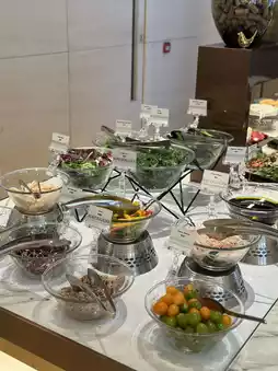 The salad bar offers a variety of options, including cold-cut platters, cheese platters, fruits, and diverse salad choices: Korean Kimchi Chicken Salad, Superfood Salad, Thai Beef Salad, Caesar Salad, Tomato Buffalo Cheese Salad, and more—eight flavors in total!