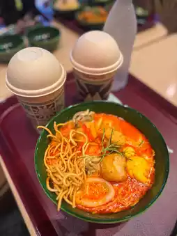The dish is quite rich in ingredients, including shrimp, scallops, squid, crispy noodles, and a Mickey-shaped egg. The soup base has a strong coconut aroma with a hint of spiciness, making it enjoyable without being overwhelming. Paired with rice noodles, the portion was more than sufficient.