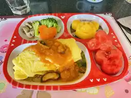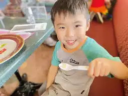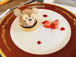 Shawn ordered his favorite tomato omelette rice 🍳. This children's meal comes with Mickey watermelon, mango omelette, milk or juice. It can be finished in 3 seconds, so you can imagine how delicious this children's meal is 😋 For dessert, we chose Duffy and friends waffles with vanilla ice cream 🍨 and Duffy chestnut 🌰 chocolate tart. For drink, we chose the caramel ice cream special drink, which was not bad.