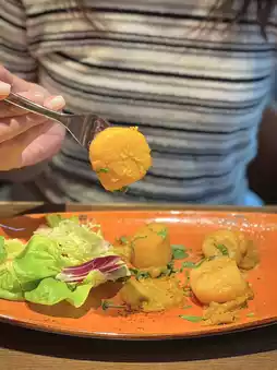 The scallops are sweet and savory, with a slightly crispy exterior and a slightly spicy flavor. The sweet and sour creamy eggplant and pineapple jam adds a refreshing touch. 👍🏻