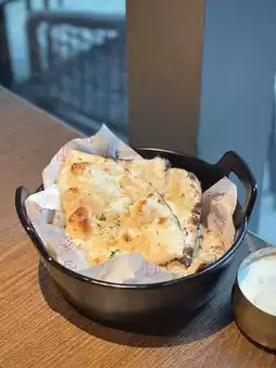 The naan is perfectly crispy, soft on the inside, and has a rich garlic flavor~🤩