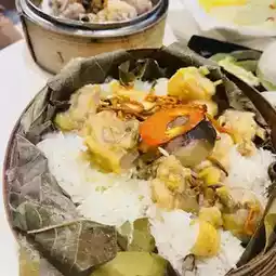 Super large portion, with steamer lotus leaves as a base, mushroom smooth chicken with insect fungus, chicken is really super seasoned and very smooth, rice steamed just right, absorb all the flavor of chicken oil and chicken juice, plus a little soy sauce, the whole steamed rice is excellent, very tasty