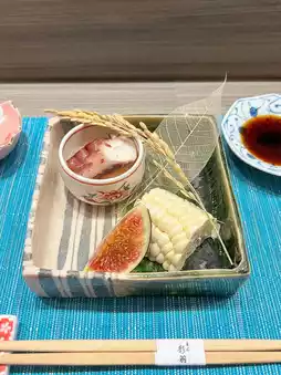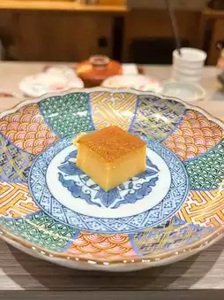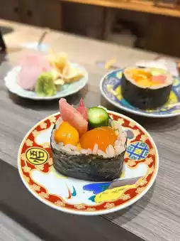 ➊ Irohata roll filled with sea urchin, toro, pickled egg yolk, and cucumber – a colorful and appetizing dish