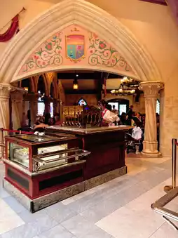 📍 The restaurant is right next to the carousel. The entrance is stunningly decorated with a dreamy palace design, complete with a statue of Sleeping Beauty dancing with a prince in the center. 💃🏻 It feels like stepping straight into a fairytale. The restaurant offers both indoor and outdoor seating, perfect for taking photos or just relaxing.
