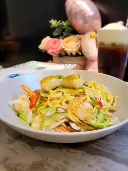 🦐 Garlic Phoenix Tail Shrimp Scallops Wild Mushroom Olive Oil Pasta: Savory and delicious