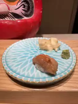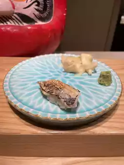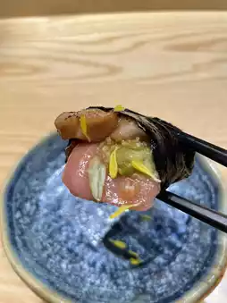 Naked sandwiched between medium and large toro, soft and smooth with an oily aroma, basil leaves and mustard reduce the oil of the toro.