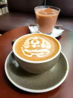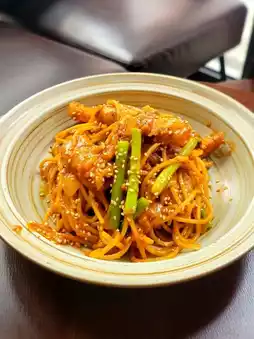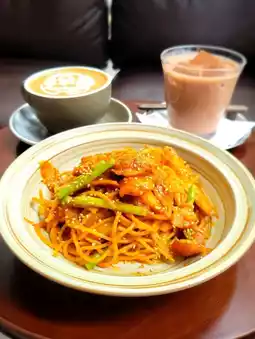 Korean spicy sauce mixed with peanut butter stir-fried Matsusaka pork spaghetti🌶, the sauce is very tasty, the peanut flavor is very strong🥜, the Matsusaka pork is very crispy. We also ordered mocha & dozy iced chocolate with latte art.