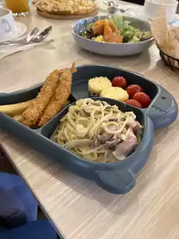 Pasta, french fries, fried shrimp, fruit, small cakes, drinks. Loaded with dinosaur plates, the children were already very happy to see them, and there was also a piece of fun toys tim.