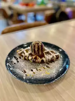 The photo is beautiful, the waffles are crispy on the outside and soft on the inside, plus chocolate ice cream and crumbled almonds, both adults and children love.