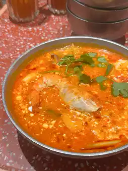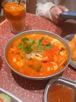 Thai tom yum soup 🥣 tom yum soup has shrimp and mushrooms 🦐🍄🟫 moderately spicy and sour 🌶️ very appetizing 😛