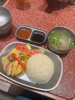 Thai Hainanese chicken rice 🐓 Hainanese chicken thin skin and tender meat Juicy😋 dipped in Thai sour and spicy sauce and black sauce 🌶️ extra taste 😗 Also cucumber and tomato accompaniment 🥒 with carrot chicken soup 🥕🥣