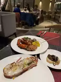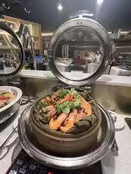 The Boston lobster poached in cream, butter, and white wine in the hot food section is a must-try. The lobster meat absorbs the aroma of the white wine and butter, resulting in a rich yet non-greasy texture. Chinese seafood dishes like black pepper crab meat and steamed shrimp with sticky rice in a bamboo basket with Hua Diao sauce are also standouts.