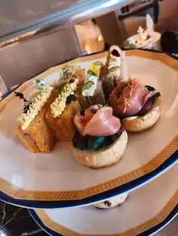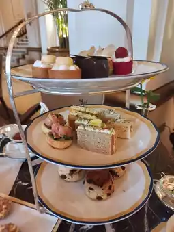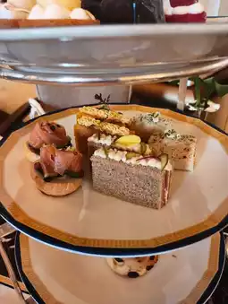 The savory items include a variety of finger sandwiches, such as 🐟 smoked salmon with horseradish cream open sandwich, salami and Swiss cheese 🧀 sandwich, 🦐 prawn and egg salad sandwich, and 🥒 traditional cucumber sandwich. The smoked salmon open sandwiches were the best, while the others were relatively ordinary. Additionally, there was a 🥓 bacon and cheese quiche, which honestly had a cheap appearance and taste.