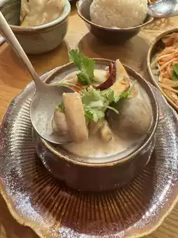 We started with a set menu for two. The coconut chicken soup had a rich, generous broth and was a good size. We loved the flavorful straw mushrooms. You can choose between yellow or green curry, with chicken, beef, or pork. We opted for the yellow beef curry, which was served with grilled buns dipped in the yellow curry sauce. The buns were delicious.