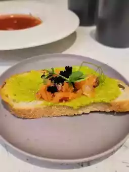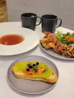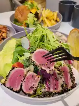 This super brand dish is really big ❗️ There are many healthy ingredients ❤️, the tuna fried with sesame seeds is the highlight! Super delicious! There are also chicken strips, spring eggs, purple sweet potato puree, kale, very fresh salad vegetables, and sourdough bread.