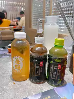 Drinks 🥤: A selection of sodas, teas 🍵, soy milk 🍼, and fruit juices 🍇🧃.