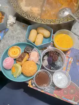 Desserts 🍮: Options included mango sago 🥭, taro balls with grass jelly, mochi, puddings, and cakes 🍰.