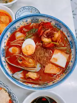 Curry Laksa 🥢 Laksa soup is rich with coconut flavor 🥥 Ingredients include potatoes, chicken pieces 🐔 spring rolls, fish fillets 🐠 sprouts, shrimp 🦐 fried bean curd skin, mint leaves 🌱 very filling 🤤