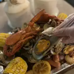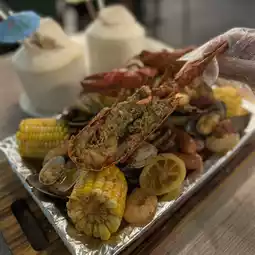 The presentation is very appealing, featuring lobster, clams, New Zealand mussels, shrimp, frankfurter sausages, corn, and potatoes. The lobster is served halved, fresh, and springy. The mussels are plump and sweet, the large shrimp are firm and juicy, and the sweet corn absorbs the flavorful and spicy sauce. The portion is generous, perfect for two people to share!