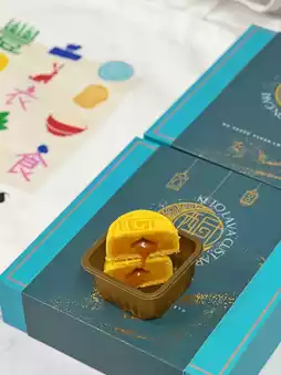 Four to a box, the new design exudes elegance. The mooncake features a rich, creamy outer layer and a delicate, runny inner layer of custard, creating a rich, yet non-greasy texture.