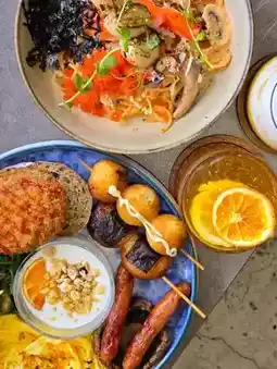 We ordered the All Day Breakfast, which came in a generous portion with a variety of items. The sakura shrimp scrambled eggs were silky smooth with a hint of savory shrimp flavor. The smoked black pork sausage was different from regular sausages, with a firmer texture and a smoky aroma. The Japanese cheese mochi and takoyaki skewers were quite unique, especially the mochi, which was crispy on the outside and chewy with a cheesy flavor inside. The grilled portobello mushroom was juicy, and the fried purple sweet potato patty was sweet with a crispy exterior and soft interior. Paired with fresh salad greens and a yogurt cup, it was refreshing and balanced. Overall, the All Day Breakfast was flavorful, diverse, and great value for money.