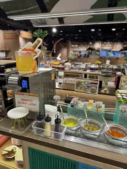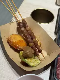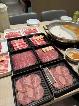 The American premium chuck short ribs set, coconut milk Wenchang chicken pot, and Gym Gym self-service set are all very appealing 🤩. This time, I chose the American premium chuck short ribs set to enjoy some delicious beef 🐮! The hotpot buffet set B also includes an unlimited flow of shrimp, where you can cook live seafood right after catching it 👩🏻🍳. Additionally, there are various freshly made skewers 🍢 and Thai desserts 🍡 available!