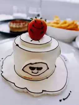 🎂 2D Cake: The strawberry 2D cake looks like a character straight out of a comic! A single strawberry sits atop the snowy white cream, with simple and adorable lines. The sponge cake is soft and fluffy, perfectly paired with the light cream (portion suitable for sharing between two).