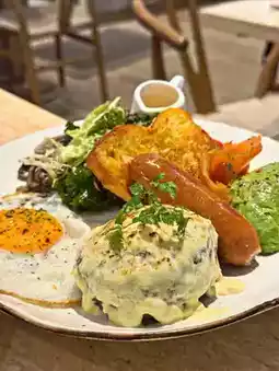 The bread is sweet, the sausage is crispy, and drizzled with syrup, even the thick-cut burger steak is not greasy at all.