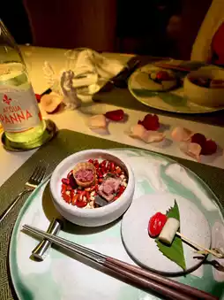 🔸Amuse Bouche Payment: Vinegar Burdock Tomato, Tuna Tempura, Beef Tartare (Fresh and Crispy Appetizer Fresh)