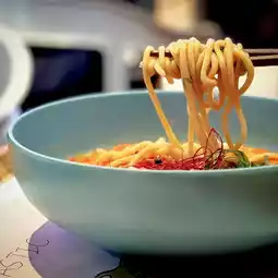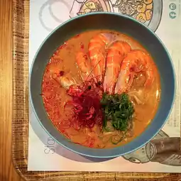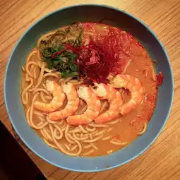 Fish Ramen in Shrimp ... The vibrant orange-red roasted bone and rich shrimp broth are incredibly fragrant and delicious, complementing the springy fish ramen with a truly high-quality texture. The fresh, sweet prawns add a touch of umami to the mix, truly delicious.