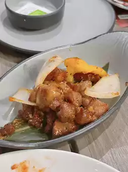The cold bacon is tender 😗 with Thai hot and sour sauce 🌶️ very appetizing 😛 Argentinian red shrimp are big and crispy 😍