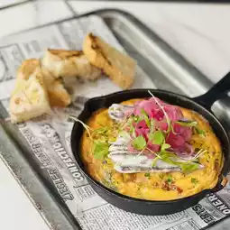 The Spanish egg cake served in an iron pan, the omelet is added with red onion, red pepper, cherry tomatoes and other side dishes, the top is placed with silver fish fillet, and pickled cabbage strips, the egg flavor is strong enough to eat with sourdough bread, very Spanish flavor 🇪🇸