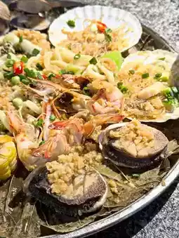 Next on the table was steamed seafood with bacon, crayfish, scallops, prawns, mussels, lobster slices and Tsukiji udon. Simple garlic and shallots. Put it in lotus leaves to steam, it is particularly fragrant, the seafood is very clear and sweet.