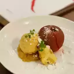 Toasted apples soaked in Raspberry sugar overnight, then slow cooked at low temperature, very soft, melting in the mouth, very thoughtful, with sweet honey cake, in addition sweet potato ice cream first time to eat, do not know thought they were eating sweet potatoes, taste good and not sweet, the whole dessert is very creative, the manager revealed that this dessert is not in the regular menu, before the trial stage, but too many customers can eat in the main menu