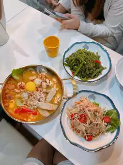 Seafood Tom Yum Army Stew (Small) 🍲 The Tom Yum soup is rich, sour, and spicy 🌶️ with an abundance of ingredients 😍 including shrimp 🦐, squid 🦑, scallops, mussels 🐚, minced meat, grilled pork belly 🐖, and pork rolls 🐷. Delicious and indulgent 🤤
