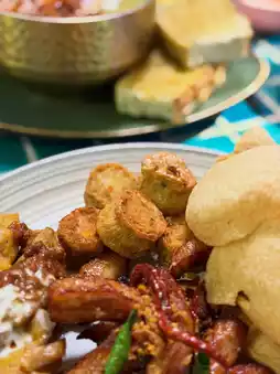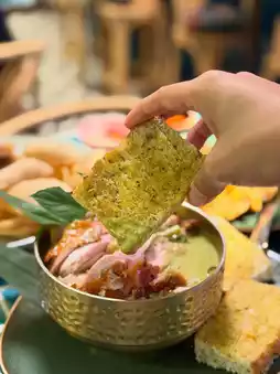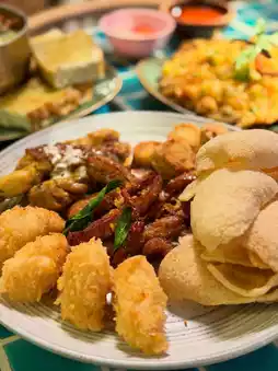 For spice lovers, the green curry roast chicken is a must-try! It's aromatic, spicy, and authentic 🌶️, paired with herb bread that is super appetizing 👍🏻. The appetizer platter was very generous in portion. I absolutely loved the crispy shrimp cakes, which were bouncy and flavorful, and the pork neck was delightfully chewy 😋. There were also plenty of shrimp cakes, satay chicken 🍗 with a strong coconut aroma 🤤, and the Thai-style fried oyster pancake was packed with ingredients 😍. It was loaded with fresh oysters, fried to a crispy perfection, and paired with a tangy and spicy sauce. Adding bean sprouts and lettuce balanced the richness, making it incredibly delicious 😋.