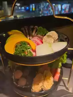 Perfect for Instagram photos! It comes in two tiers with meat, vegetables, mushrooms, and meatballs, ideal for those who want to try a bit of everything. 😊