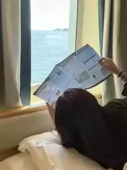 Day 2: Sleep until you wake up naturally, once you pull the curtains, you will see the endless sea🌊. I go to lunch without makeup🥣, and I always look for beautiful scenery on the boat to take pictures.