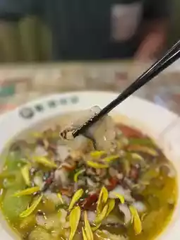 Pickled fish: sour and spicy, rich in golden color, sourness from pickled cabbage, pickled pepper or vinegar, fresh and not pungent, with fermented mellow aroma. Millet spicy, mild spiciness but strong aftertaste. The freshness is imparted by the tenderness of the fish bone broth and fish fillets, the soup is rich but not greasy. The broth is bright golden yellow, moderately thick, can hang on the fish meat tender without fishy taste, using herring, thinly cut fish slices and marinated with egg white or starch, smooth and tender, melt in the mouth. Served with sauerkraut, bean sprouts, vermicelli, golden mushrooms, etc., after absorbing the soup juice, sour and spicy addictive, increased crispness.