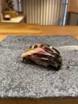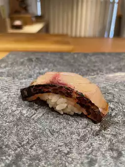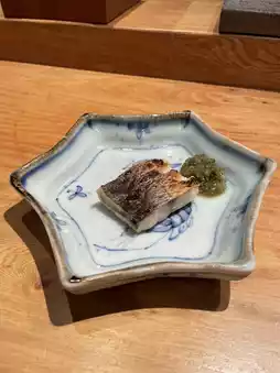 The sturgeon grilled with charcoal has a charcoal aroma and a firm texture.